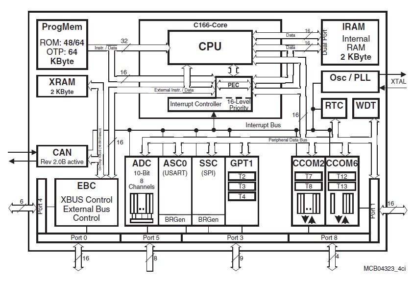 SAK-C164CI-8EM features: (1)High Performance 16-bit CPU with 4-Stage Pipeline; (2)16-Priority-Level Interrupt System with 32 Sources, Sample-Rate down to 40 ns; (3)8-Channel Interrupt-Driven Single-Cycle Data Transfer Facilities via Peripheral Event Controller (PEC); (4)Clock Generation via on-chip PLL (factors 1:1.5/2/2.5/3/4/5), via prescaler or via direct clock input; (5)On-Chip Memory Modules; (6)On-Chip Peripheral Modules; (7)Up to 4 MBytes External Address Space for Code and Data; (8)Idle, Sleep, and Power Down Modes with Flexible Power Management; (9)Programmable Watchdog Timer and Oscillator Watchdog; (10)Up to 59 General Purpose I/O Lines, partly with Selectable Input Thresholds and Hysteresis.